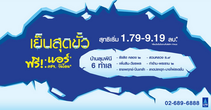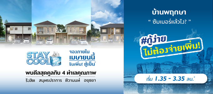 โปรโมชั่น : "ซัมเมอร์แล้วไง" บ้านพฤกษา "STAY COOL" ร้อนไหนไม่หวั่น ลงทะเบียนออนไลน์รับดีลสุดคูล กับ 4 ทำเลคุณภาพ! รังสิต-สมุทรปราการ-ติวานนท์-อยุธยา จองภายในเมษายนนี้ รับเพิ่ม! ตู้เย็น*