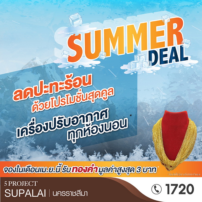 โปรโมชั่น : Summer Deal ลดปะทะร้อน กับโปรโมชั่นสุดคูล 5 โครงการศุภาลัย นครราชสีมา ด้วยโปรโมชั่น เครื่องปรับอากาศทุกห้องนอน* จองในเดือนเมษายนนี้ รับทองคำมูลค่าสูงสุด 3 บาท*