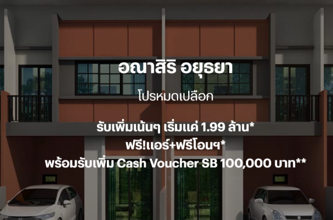 อณาสิริ อยุธยา" โปรฯ หมดเปลือก รับเพิ่มเน้นๆ เริ่มแค่ 1.99 ล้านบาท* ฟรี! แอร์ + ฟรีโอนฯ* พร้อมรับเพิ่ม Cash Voucher SB 100,000 บาท**
