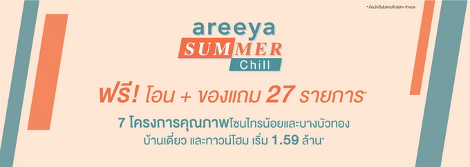 www.ananda.co.th โปรโมชั่น : แคมเปญพิเศษ Areeya Summer Chill ฟรี! โอน + ของแถม 27 รายการ* 7 โครงการคุณภาพ โซนไทรน้อยและบางบัวทอง บ้านเดี่ยวและทาวน์โฮม เริ่ม 1.59 ล้านบาท*