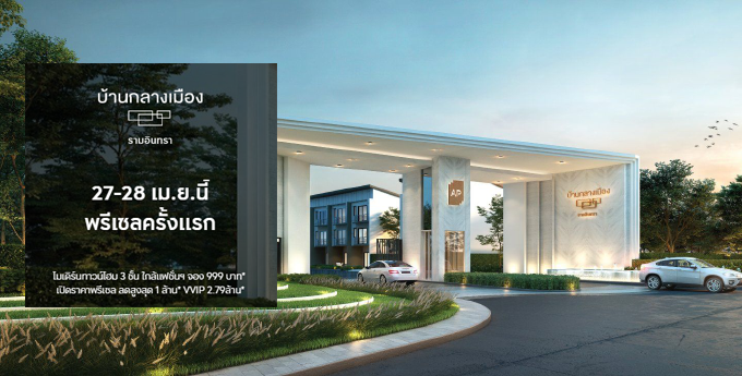 บ้านกลางเมือง รามอินทรา" 27 - 28 เมษายน 2562 นี้ พรีเซลครั้งแรก โมเดิร์นทาวน์โฮม 3 ชั้น ใกล้แฟชั่นฯ จอง 999 บาท* เปิดราคาพรีเซลสุดพิเศษ ลดเฉพาะวันงานสูงสุด 1 ล้านบาท* VVIP พิเศษ 2.79 ล้านบาท* (จากปกติ 3.79 ล้านบาท)