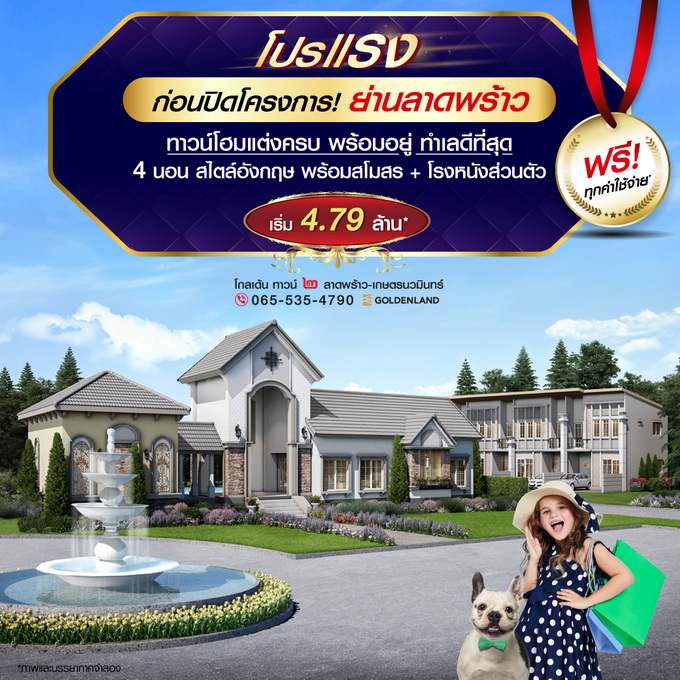 โกลเด้น ทาวน์ ๒ ลาดพร้าว-เกษตรนวมินทร์" โปรฯ แรง! ก่อนปิดโครงการ ฟรี! ทุกค่าใช้จ่าย* ทาวน์โฮมแต่งครบ พร้อมอยู่ ทำเลดีที่สุดในโครงการ เดินทางสะดวกใจกลางเมือง ย่านลาดพร้าว&เกษตรนวมินทร์ ใกล้เซ็นทรัลอีสต์วิลล์ เริ่ม 4.79 ล้าน*