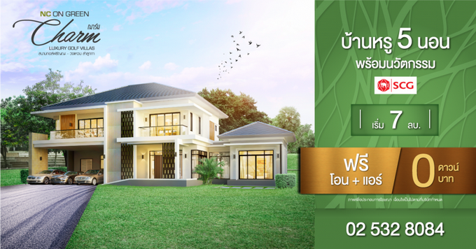 โปรโมชั่น: "เอ็น ซี ออนกรีน ฌาร์ม สนามกอล์ฟธัญญะ - วงแหวน" บ้านหรู 5 ห้องนอน พร้อมนวัตกรรม SCG ฟรี! โอน+แอร์ ดาวน์ 0 บาท เริ่ม 7 ล้านบาท