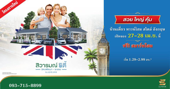 30 เม.ย. 62 690"สิวารมณ์ ซิตี้ นิคมพัฒนา-ระยอง" เปิดจอง 27-28 เม.ย. นี้ ลงทะเบียนรับสิทธิพิเศษ เริ่ม 1.29 - 2.99 ลบ.*