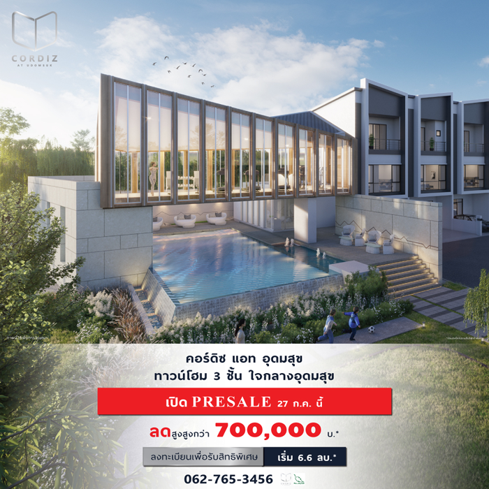24 ก.ค. 62 2,247"คอร์ดิซ แอท อุดมสุข" ทาวน์โฮม 3 ชั้น Pre-sale 27 ก.ค. 62 นี้ เริ่ม 6.6 ล้านบาท* ลงทะเบียนที่นี่