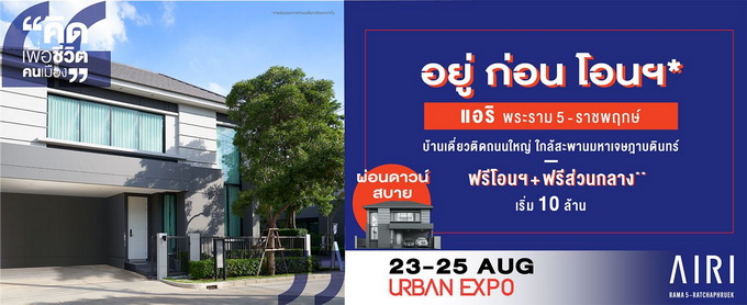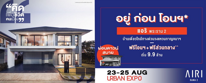 แอริ พระราม 2" 23 - 25 สิงหาคม 2562 นี้ พบกับ "Urban Expo คิดเพื่อชีวิตคนเมือง" อยู่ก่อนโอน* บ้านเดี่ยวใกล้ทางด่วนวงแหวนกาญจนาภิเษก ฟรีโอนฯ+ฟรีส่วนกลาง* เริ่ม 9.9 ล้านบาท