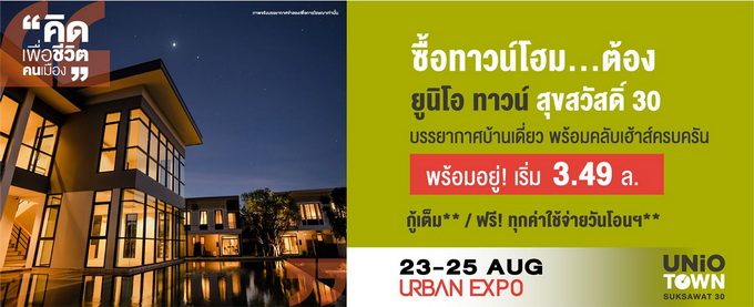 ยูนิโอ ทาวน์ สุขสวัสดิ์ 30" 23 - 25 สิงหาคม 2562 นี้ พบกับ "Urban Expo คิดเพื่อชีวิตคนเมือง" ทาวน์โฮมบรรยากาศบ้านเดี่ยว พร้อมคลับเฮ้าส์ครบครัน กู้เต็ม**/ฟรี! ทุกค่าใช้จ่ายวันโอนฯ* เริ่ม 3.49 ล้านบาท
