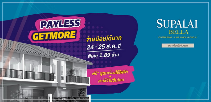ศุภาลัย เบลล่า วงแหวน - ลำลูกกา คลอง 6" Payless Get More จ่ายน้อย ได้มาก 24 - 25 สิงหาคม 2562 นี้ พิเศษ 1.89 ล้านบาท ฟรี! ชุดเครื่องใช้ไฟฟ้า + ค่าใช้จ่ายวันโอน*