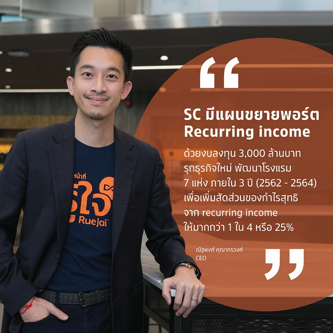 นายณัฐพงศ์ กล่าวเพิ่มเติมสำหรับแผนรุกขยายธุรกิจใหม่ว่า "SC มีแผนขยายพอร์ต recurring income เพื่อการเติบโตอย่างยั่งยืนในอนาคต โดยวางงบลงทุน 3,000 ล้านบาท สำหรับขยายธุรกิจใหม่ พัฒนาโรงแรมในกลุ่มราคา mid-to-upscale ทำเลกรุงเทพและเมืองท่องเที่ยว 7 แห่ง ภายใน 3 ปี (2562 - 2564) เพื่อเพิ่มสัดส่วนของกำไรสุทธิจาก recurring income ให้มากกว่า 1 ใน 4 หรือ 25%"