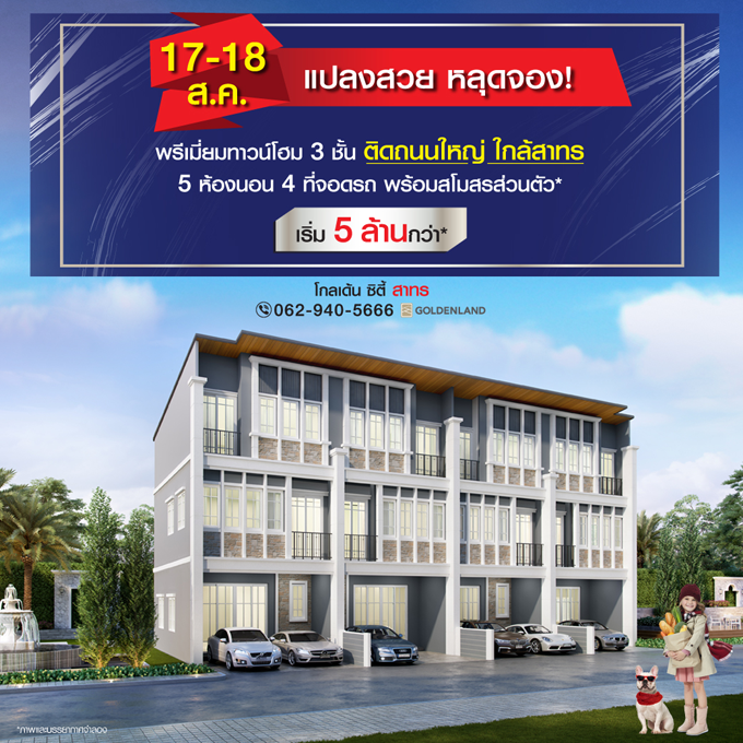 Promotion : 17-18 ส.ค. นี้ เปิดโซนใหม่ ใกล้คลับเฮ้าส์ เริ่ม 3 ล้านกว่า* ทาวน์โฮม ทำเลสาทร ใกล้ย่านธุรกิจ สาทร-สีลม เพียง 6 กม. จากสาทร