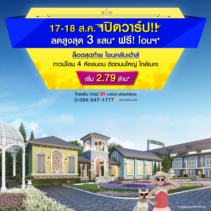 Promotion : 17-18 ส.ค. นี้ เปิดวาร์ป ลดสูงสุด 300,000 บาท* ฟรีโอนฯ โครงการใหม่ ติดถนนใหญ่ ใกล้เมกะบางนา ทาวน์โฮม สไตล์อังกฤษ 4 ห้องนอน 3 ห้องน้ำ อลังการสโมสร+โรงหนังส่วนตัว เริ่มต้นเพียง 2.79 ล้าน*
