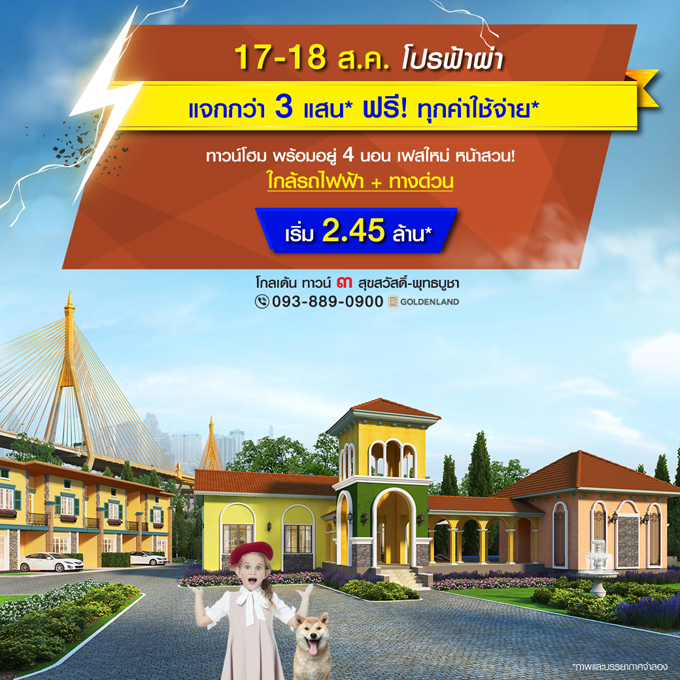 Promotion : 17-18 ส.ค. นี้ โปรฟ้าผ่า แจก 3 แสน* ฟรี! ทุกค่าใช้จ่าย* เดินทางสะดวก ใกล้รถไฟฟ้า+เซ็นทรัล ทาวน์โฮม ทำเล สุขสวัสดิ์-พุทธบูชา 4 ห้องนอน สไตล์อิตาลี อลังการสโมสร+โรงหนังส่วนตัว* เริ่ม 2.45 ล้าน*