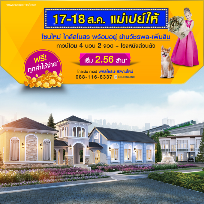 Promotion : 17-18 ส.ค. นี้ แม่เปย์ให้ ฟรี ทุกค่าใช้จ่าย* เปิดโซนใหม่ ใกล้สโมสร ย่านวัชรพล-เพิ่มสิน ทาวน์โฮมพร้อมอยู่ 4 ห้องนอน อลังการสโมสร+โรงหนังส่วนตัว เดินทางสะดวกบนทำเลศักยภาพ ใกล้รถไฟฟ้า และทางด่วน เริ่ม 2.56 ล้าน*