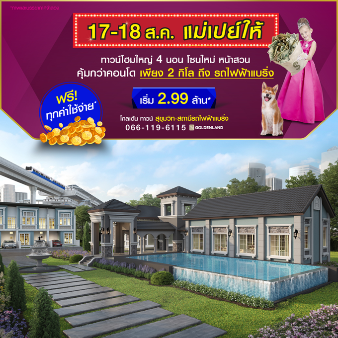 Promotion : 17-18 ส.ค. นี้ แม่เปย์ให้ ฟรี! ทุกค่าใช้จ่าย* ทาวน์โฮมใหญ่ 4 ห้องนอน โซนใหม่ หน้าสวน คุ้มกว่าคอนโด เพียง 2 กม. ถึงรถไฟฟ้าแบริ่ง เริ่ม 2.99 ล้าน*