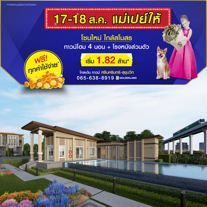 Promotion : 17-18 ส.ค. นี้ แม่เปย์ให้ ฟรี! ทุกค่าใช้จ่าย* เปิดเฟสใหม่ ใกล้สโมสร ทาวน์โฮมพร้อมอยู่ 4 ห้องนอน ย่านศรีนครินทร์ ใกล้รถไฟฟ้า+ทางด่วน เริ่มต้นเพียง 1.82 ล้าน*