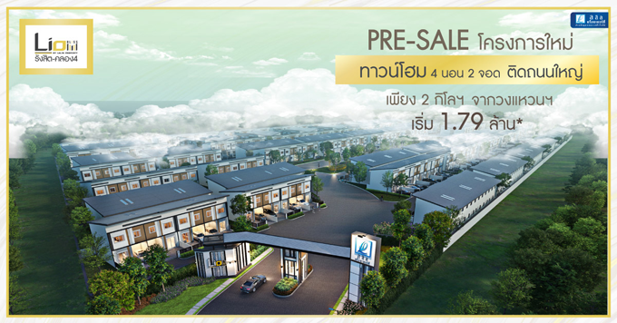 PRE-SALE โครงการใหม่ ไลโอ บลิสซ์ รังสิต-คลอง4 ทาวน์โฮม 4 ห้องนอน 2 ที่จอดรถ ติดถนนใหญ่ เพียง 2 กิโลเมตร จากวงแหวนฯ เริ่ม 1.79 ล้าน *เงื่อนไขเป็นไปตามที่บริษัทฯ กำหนด