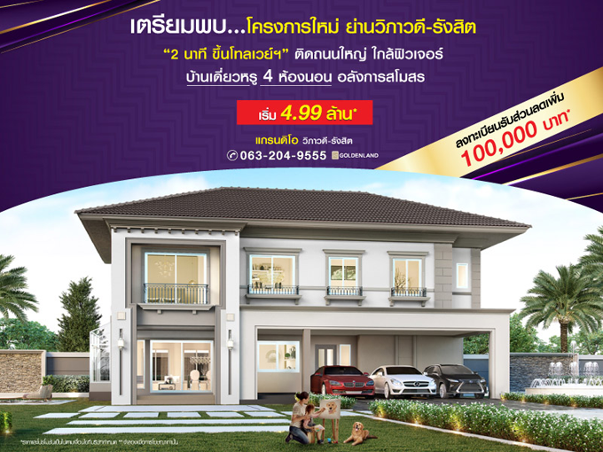 แกรนดิโอ วิภาวดี - รังสิต บ้านเดี่ยวหรู 4 ห้องนอน พร้อมสโมสร ติดถนนใหญ่ ใกล้ฟิวเจอร์ฯ เริ่ม 4.99 ล้าน