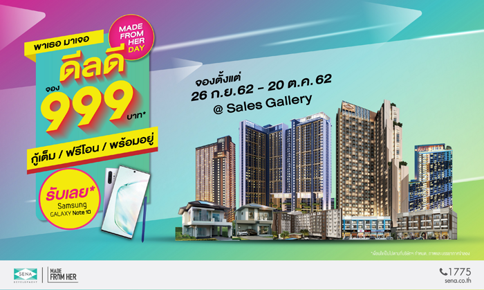 เพื่อมอบประสบการณ์ชีวิตที่ดีที่สุดให้กับลูกบ้านทุกคน เสนาดีเวลลอปเม้นท์ ผู้นำด้านอสังหาริมทรัพย์ของไทยที่สร้างสมประสบการณ์มากว่า 40 ปี สร้างสรรค์คอร์ปอเรทแคมเปญ MADE FROM HER ตอกย้ำแนวคิด "ผู้หญิงอยู่สบาย...ผู้ชายก็แฮปปี้" ที่ใส่ใจ คิดละเอียด หลายชั้นแบบผู้หญิง มาพัฒนาโครงการเพื่อตอบสนองความต้องการของทุกคนในครอบครัวได้อย่างครบถ้วน พร้อมเตรียมส่งดีลดีๆ สุดพิเศษแห่งปีในงาน "MADE FROM HER DAY พาเธอมาเจอดีลดี" จอง 999 บาทกู้เต็ม ฟรีโอน พร้อมอยู่ กว่า 20 โครงการ บ้านเดี่ยว และคอนโดมิเนียม ในหลายทำเลเด่นทั่วกรุงเทพฯ และปริมณฑล อาทิ เสนา พาร์ค แกรนด์ รามอินทรา, เสนา พาร์ค วิลล์ รามอินทรา - วงแหวน, เสนา วิลล์ บรมราชชนนี - สาย 5, เสนา ทาวน์ นวมินทร์, นิช ไพรด์ เตาปูน - อินเตอร์เชนจ์, นิช ไพรด์ ทองหล่อ - เพชรบุรี, นิช โมโน สุขุมวิท - แบริ่ง, นิช โมโน สุขุมวิท - ปู่เจ้า, นิช โมโน รัชวิภา เป็นต้น พร้อมรับ "Sumsung Galaxy Note 10" ที่สำนักงานขายกว่า 20 โครงการ ตั้งแต่วันนี้ - 20 ตุลาคม 2562