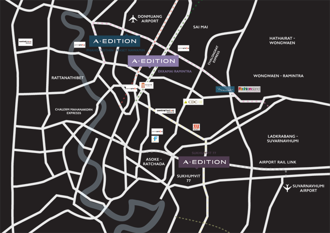 แผนที่ตั้งของโครงการ เอ อิดิชั่น ทั้ง 3 โครงการเอ อิดิชั่น สุขุมวิท 77 (A Edition Sukhumvit 77)โลเคชั่นใจกลางแหล่งชุมชนหลักบนเส้นถนนอ่อนนุช ที่เพียบพร้อมไปด้วยสิ่งอำนวยความสะดวกครบถ้วน ไม่ว่าจะเป็นโรงเรียน โรงพยาบาล สถานีตำรวจ พร้อมด้วยแหล่งช็อปปิ้งขนาดใหญ่ทั้ง Season Square, Paradise Park, Thanya Shopping Park, รวมไปถึงโครงการ Life Style Mall "Pickadaily" ที่มีความโดดเด่นด้วยการจำลองชุมชนผู้ดีชาวอังกฤษมาไว้ใกล้ๆ บ้านคุณเอ อิดิชั่น พหลโยธิน - เกษตรนวมินทร์ (A Edition Paholyothin - Kasetnawamin)เอกสิทธิ์ของชีวิตที่แวดล้อมไปด้วยความสะดวกสบายภายใต้สังคมมีระดับ ที่ทำให้ชีวิตในโครงการเต็มไปด้วยบรรยากาศแห่งความเป็นอยู่ของคนเมืองที่ต้องการความสงบ และเรียบง่าย หลีกหนีจากความวุ่นวายเอ อิดิชั่น เอกมัย - รามอินทรา (A Edition Ekkamai - Ramintra)ทุกการเดินทางสะดวกและง่ายที่สุดด้วยทำเลใจกลางเมือง เพียง 15 นาทีสู่ใจกลางสุขุมวิท และรายล้อมไปด้วยสิ่งอำนวยความสะดวก, จุดขึ้น-ลงทางด่วน, แหล่งช้อปปิ้ง-ไลฟ์สไตล์ และโรงพยาบาลชั้นนำ