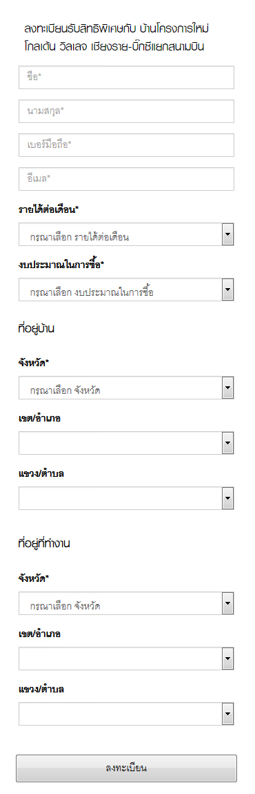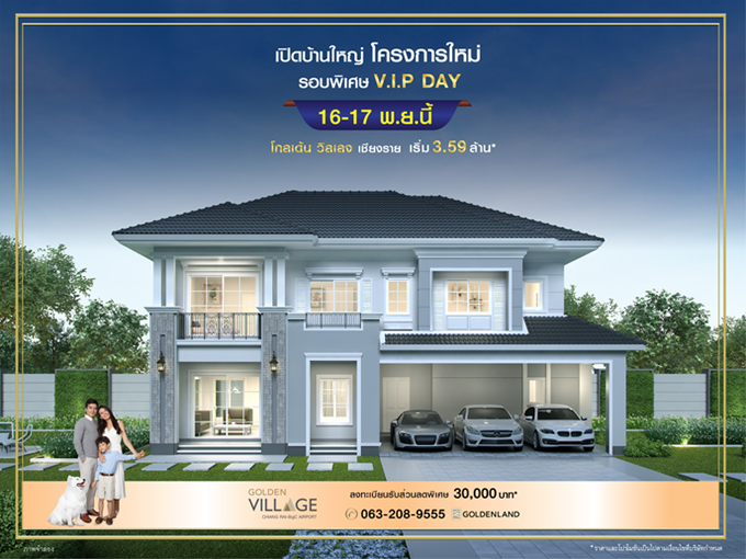 โกลเด้นแลนด์ เปิดให้จอง โกลเด้น วิลเลจ เชียงราย-บิ๊กซีแยกสนามบิน (Golden Vilage Chiangrai-Big C Yaek Sanambin) เตรียมพบโครงการใหม่ ที่เมืองเชียงราย กับบ้านเดี่ยว ล้อมรอบด้วยทะเลสาบ พร้อมคลับเฮ้าส์ แห่งเดียวในเมืองเชียงราย* ท่านที่สนใจสามารถลงทะเบียนจองออนไลน์เพื่อรับส่วนลดเพิ่ม 30,000 บาท* ได้ที่เว็บไซต์ของโกลเด้นแลนด์ค่ะราคาเริ่ม 3.59 ล้านบาท*ผู้ที่สนใจ สามารถลงทะเบียนจองออนไลน์เพื่อรับส่วนลดเพิ่ม 30,000 บาท*ได้ที่ลิงก์ข้างล่างนี้สอบถามข้อมูลเพิ่มเติม โทร. 063-208-9555 เว็บไซต์ www.goldenland.co.th และFanpage : https://www.facebook.com/GOLDENLANDข่าว-โปรโมชั่นล่าสุดอื่นๆ