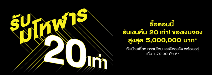 ดูโครงการที่เข้าร่วมที่นี่ โปรโมชั่น: ซื้อตอนนี้ รับเงินคืน 20 เท่า! ของเงินจอง สูงสุด 5,000,000 บาท* กับบ้านเดี่ยว ทาวน์โฮม และดีคอนโด พร้อมอยู่ เริ่ม 1.79 - 30 ล้านบาท* รับโปรโมชันพิเศษแบบมหึมา เยอะกว่าทุกครั้ง คุ้มกว่าที่เคย พร้อมข้อเสนอที่ดีที่สุดส่งท้ายปี "ให้แรง แซงรัฐ" แสนสิริให้มากกว่า ฟรีโอน ฟรีจดจำนอง พร้อมรับทองคำสูงสุด 60,000 บาท* และโปรฯ พิเศษอีกมากมาย เฉพาะบ้าน ทาวน์โฮม และดีคอนโด ราคาไม่เกิน 3 ล้าน เมื่อซื้อ และโอน ภายในปีนี้เท่านั้น
