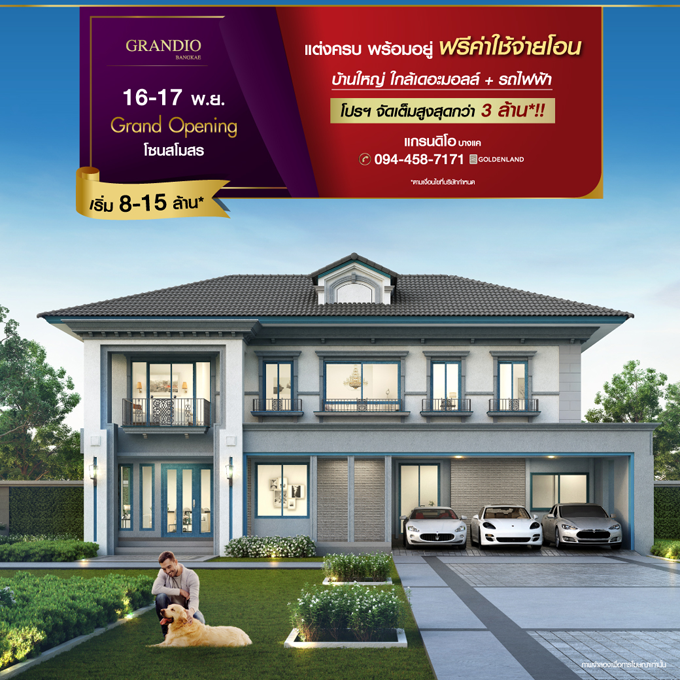 แกรนดิโอ บางแค" 16-17 พฤศจิกายน 2562 นี้ GRAND OPENING โซนสโมสร บ้านเดี่ยวสุดหรู แต่งครบ พร้อมอยู่ ฟรี! ค่าใช้จ่ายโอน* โปรฯ จัดเต็ม สูงสุดกว่า 3 ล้าน* เดินทางสะดวก ใกล้เดอะมอลล์ บางแค+รถไฟฟ้า ราคาเริ่ม 8-15 ล้าน* คุ้มกว่านี้ไม่มีมีอีกแล้ว รีบมาก่อนหมด