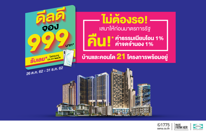 www.ananda.co.th โปรโมชั่น: ไม่ต้องรอ! เสนาให้ก่อนมาตรการรัฐ คืน! ค่าธรรมเนียมโอน 1% ค่าจดจำนอง 1% บ้านและคอนโด 21 โครงการพร้อมอยู่ ดีลดี จอง 999 บาท* รับเลย Samsung Galaxy Note 10 ตั้งแต่วันที่ 26 ตุลาคม - 31 ธันวาคม 2562