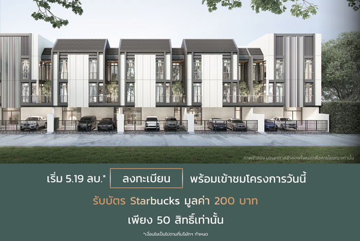 "วสนะ งามวงศ์วาน" ทาวน์โฮม 3 ชั้น เริ่ม 5.19 ลบ* ลงทะเบียนพร้อมเข้าชมโครงการ รับบัตร Starbucks มูลค่า 200 บาท เพียง 50 สิทธิ์เท่านั้น