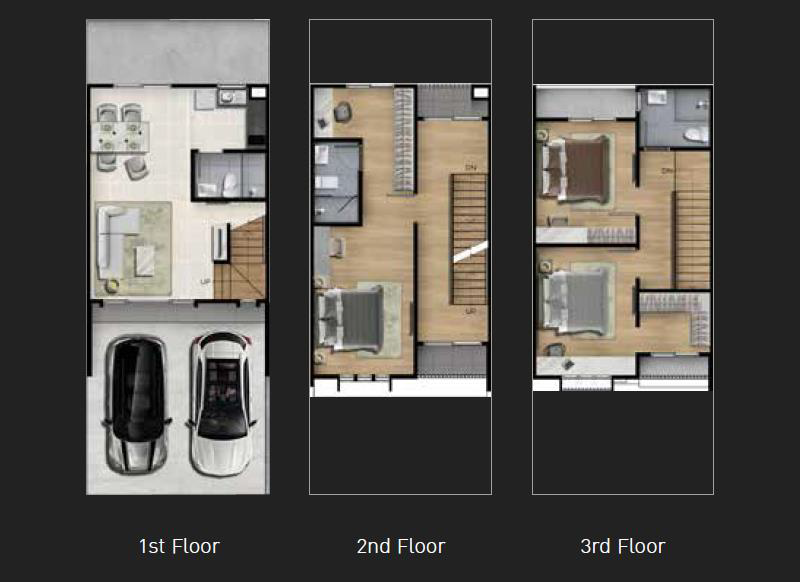 แบบบ้าน The POV ทาวน์โฮม 3 ชั้น หน้ากว้าง 5.5 เมตร พื้นที่ใช้สอยเริ่มต้น 180 ตร.ม. ประกอบไปด้วย 3 ห้องนอน 3 ห้องน้ำ 1 ครัว และ 2 ที่จอดรถ*