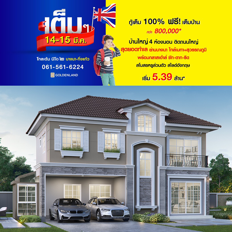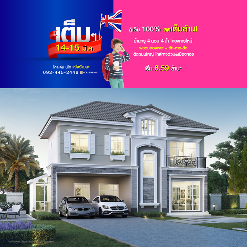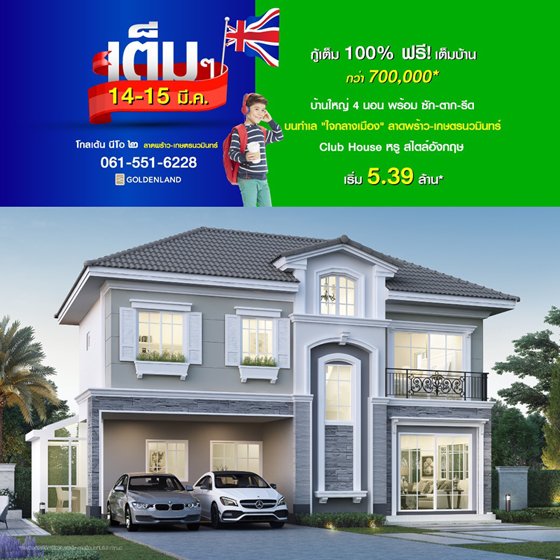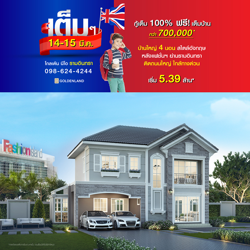 Promotion : 14-15 มี.ค. กู้เต็ม 100% ฟรี เต็มบ้าน!! คุ้ม!! รับสูงสุดกว่า 700,000 บาท บ้านใหญ่ 4 ห้องนอน สไตล์อังฤษ พร้อมห้องกลาสเฮ้าส์ ซัก ตาก รีด + โรงหนังส่วนตัว สโมสรหรูส่วนตัว สุดยอดทำเล หลังแฟชั่นฯ ติดถนนใหญ่+ทางด่วน เริ่ม 5.39 ล้าน*