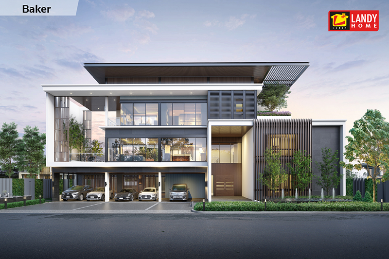 BAKER - มีขนาดพื้นที่ใช้สอยรวม 1,380 ตร.ม. ขนาดอาคาร 30x20 ม. เหมาะสำหรับที่ดินหน้ากว้าง ขนาด 204 ตร.ว. เป็นบ้าน 3 ชั้น สไตล์ Modern Villa 5 ห้องนอน 6 ห้องน้ำ 5 ที่จอดรถ ตอบโจทย์ครอบครัวใหญ่ที่มีไลฟ์สไตล์เฉพาะตัว ด้วยการออกแบบตัวบ้านเป็น L Shape มีความสูงโปร่ง พื้นที่แต่ละส่วนเชื่อมถึงกันได้อย่างสะดวก ห้องนอนกว้างขวาง มีห้องน้ำ ห้องแต่งตัว ระเบียงทุกห้อง ราคาก่อสร้างอยู่ที่ 30 ล้านบาทขึ้นไป