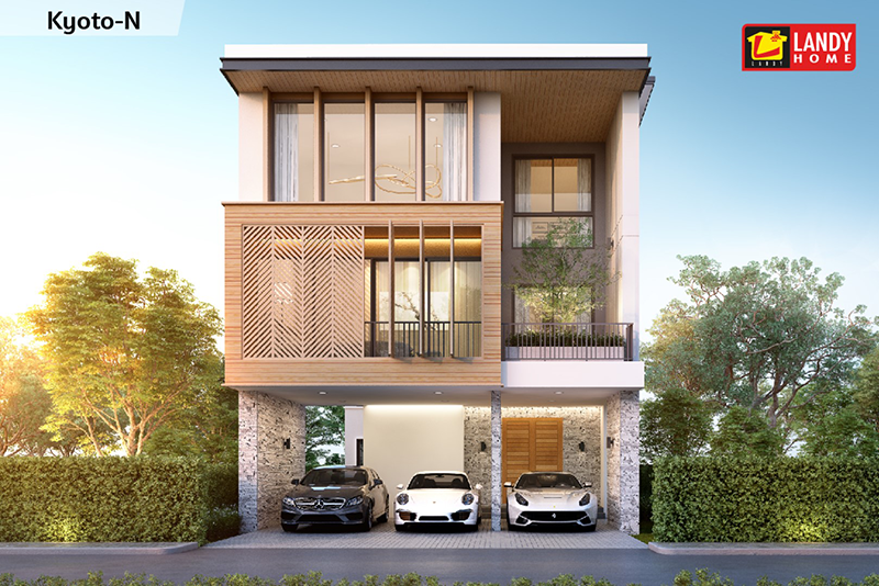 KYOTO-N - มีขนาดพื้นที่ใช้สอยรวม 555 ตร.ม. เหมาะสำหรับที่ดินหน้าแคบขนาดอาคาร 10x22 ม. ขนาดที่ดิน 91 ตร.ว. เป็นบ้านสไตล์ Modern Tropical อาคารสูง 3 ชั้น 5 ห้องนอน 5 ห้องน้ำ และ 3 ที่จอดรถ ภายในบ้านออกแบบเน้นความโปร่ง โล่ง โอ่โถงด้วยเพดานสูง โดยราคาค่าก่อสร้างอยู่ที่ 12-15 ล้านบาท