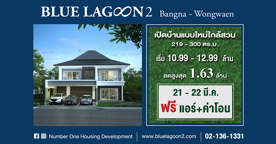 นัมเบอร์วันเฮ้าส์ซิ่ง เปิดบ้านหรูซีรีย์ใหม่ "บลูลากูน 2 บางนา - วงแหวน" จองวันงานรับเพิ่มแอร์+ค่าโอน เริ่ม 10.99 - 12.99 ล้านบาท