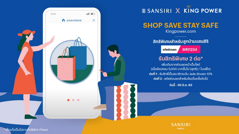 www.kingpower.com และแอปพลิเคชัน KING POWER กับแคมเปญ "SHOP SAVE STAY SAFE" ช้อปที่บ้าน มีแต่ Save กับ Safe พร้อมมอบสิทธิพิเศษสุดคุ้มเฉพาะครอบครัวแสนสิริในช่วง Work From Home รับสิทธิพิเศษ 2 ต่อ* เมื่อช้อปครบ 5,000 บาทขึ้นไป (สุทธิ) ต่อใบเสร็จ เพียงใส่รหัส code "