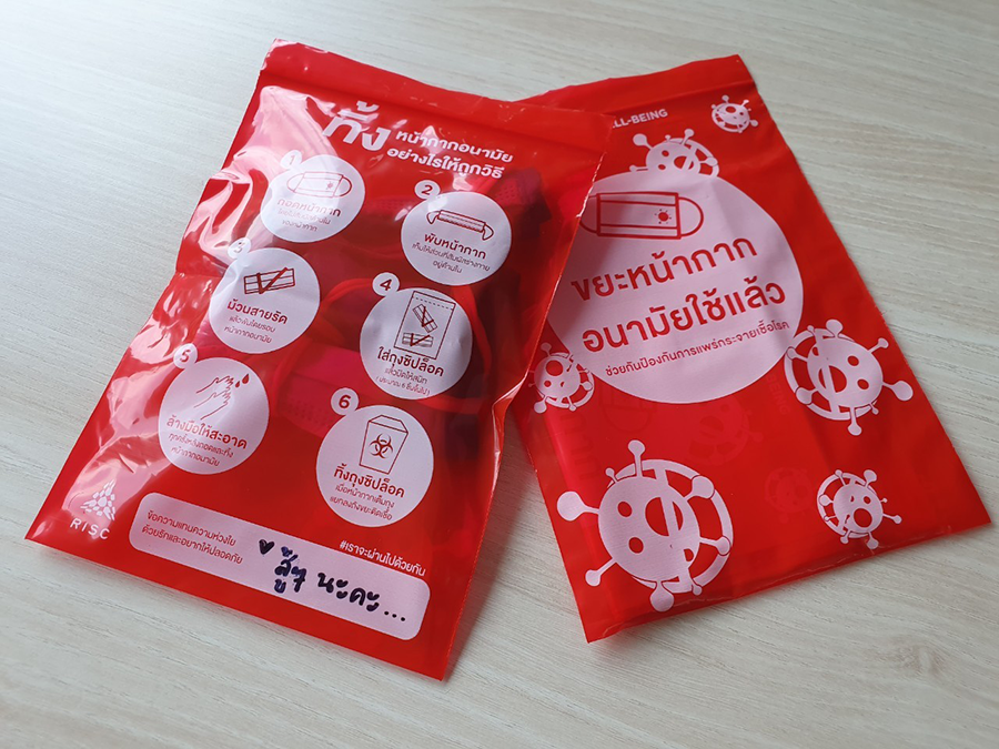 RISC จึงนำเสนอ "ถุงแดงซิปล็อกจำกัดเชื้อ" หรือ Red Zip-Lock นวัตกรรมสำหรับทิ้งหน้ากากอนามัยที่ใช้แล้วใส่ในถุงซิปล็อกสีแดง ทำให้ง่ายต่อการคัดแยก เพื่อแก้ไขปัญหาดังกล่าวให้หมดไป ซึ่งสอดคล้องกับผลสำรวจที่พบว่ากว่า 95% เห็นด้วยหากมีข้อกำหนดให้แยกทิ้งหน้ากากอนามัยใช้แล้วในถุงขยะติดเชื้อสีแดง เพื่อให้เจ้าหน้าที่เก็บขยะรู้และกำจัดอย่างถูกวิธี และกว่า 55.3% เห็นว่า ถุงแดงสำหรับทิ้งหน้ากากอนามัยใช้แล้วสะดวกสุด และเป็นการใช้พลาสติกตรงตามคุณสมบัติกันน้ำ ลดการแพร่กระจายเชื้อ และใช้อย่างคุ้มค่าเนื่องจากสามารถใส่หน้ากากอนามัยได้หลายชิ้นก่อนทิ้ง นอกจากนั้น ยังได้มีการแทรกแนวคิดการเขียนข้อความขอบคุณ ส่งต่อกำลังใจ และความห่วงใยสู่เจ้าหน้าที่เก็บขยะบน "ถุงแดงซิปล็อกจำกัดเชื้อ" หรือ Red Zip-Lock อีกด้วย