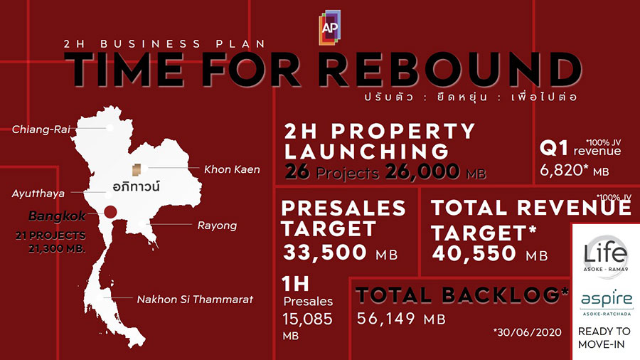 นายวิทการ จันทวิมล รองกรรมการผู้อำนวยการ สายงานกลยุทธ์องค์กรและการสร้างสรรค์ บมจ. เอพี ไทยแลนด์ กล่าวว่า "วิกฤตการณ์การแพร่ระบาดของโควิด-19 เปรียบเหมือนเป็นซูเปอร์โนวาที่ใหญ่ที่สุดในประวัติศาสตร์โลก สร้างผลกระทบที่ใหญ่และรุนแรงกว่าวิกฤตครั้งไหนในอดีต ซึ่งตลอด 6 เดือนที่ผ่านมา บริษัทฯ ดำเนินงานด้วยความระมัดระวังควบคู่ไปกับการปรับแผนงานให้สอดรับกับสถานการณ์ในแต่ละช่วงเวลา โดยมี EMPOWER LIVING เป็นจุดมุ่งหมายสำคัญขององค์กร ส่งผลให้ในครึ่งปีแรกบริษัทฯ สามารถสร้างยอดขายรวมทั้งสิ้น 15,085 ล้านบาท จากการเปิดตัวโครงการแนวราบใหม่ 14 โครงการ มูลค่า 15,500 ล้านบาท และจากโครงการอื่นๆ ที่อยู่ระหว่างการขายอีกกว่า 100 โครงการ มูลค่าคงเหลือขาย 70,000 ล้านบาท พร้อมประสบความสำเร็จในการโอนกรรมสิทธิ์ LIFE ลาดพร้าว คอนโดมิเนียมร่วมทุนที่ก่อสร้างแล้วเสร็จและเริ่มทยอยส่งมอบเมื่อเดือนมีนาคมที่ผ่านมา เชื่อว่าดีมานด์คอนโดยังไม่หาย ด้วยความคุ้มค่าของสินทรัพย์ที่มากกว่าการลงทุนรูปแบบอื่น"