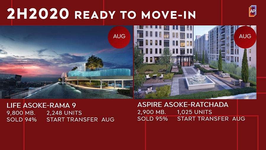 สำหรับสินค้าคอนโดมิเนียมในครึ่งปีหลังนี้ บริษัทฯ มีคอนโดมิเนียมใหม่ที่ก่อสร้างแล้วเสร็จอยู่ในแผน การส่งมอบอีกจำนวน 2 โครงการ ได้แก่ LIFE อโศก-พระราม 9 มูลค่าโครงการ 9,800 ล้านบาท สถานะยอดขาย 94% พร้อมส่งมอบเดือนสิงหาคมนี้ และ ASPIRE อโศก-รัชดา มูลค่าโครงการ 2,900 ล้านบาท ยอดขาย 95% พร้อมส่งมอบเดือนสิงหาคมนี้ พร้อมกันนี้บริษัทฯ ยังมีแบ็คล็อกคอนโดมิเนียมที่รอรับรู้ไปในอีก 3 ปีข้างหน้า (จนถึงปี 2566) มูลค่ามากถึง 42,915 ล้านบาท ด้านโครงการที่อยู่ระหว่างการขาย บริษัทฯ มีคอนโดมิเนียมที่อยู่ระหว่างการขายจำนวน 18 โครงการ มูลค่าคงเหลือขาย 21,000 ล้านบาท จึงมั่นใจว่าจากสถานการณ์ที่เกิดขึ้นถึงแม้จะส่งผลให้ผู้ซื้อคอนโดมิเนียมเพื่อลงทุนระยะสั้นชะลอการตัดสินใจลงทุน แต่ลูกค้ากลุ่มที่ซื้อเพื่อลงทุนระยะยาวก็ยังคงเห็นถึงความคุ้มค่าของการลงทุนในอสังหาริมทรัพย์ มากกว่าการลงทุนในรูปแบบอื่น และถึงแม้บริษัทฯ จะขยับแผนการเปิดตัวคอนโดมิเนียมใหม่ออกไป แต่ทีมงานทุกคนยังคงทำงานตามแผนเดิม เพื่อให้โครงการพร้อมเปิดตัวทันทีหากสถานการณ์ในไตรมาส 4 มีทิศทางที่ดีขึ้นหรือมีแรงหนุนจากมาตรการภาครัฐ