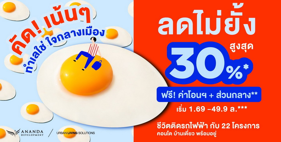 คัด! เน้นๆ ทำเลใช่ ใจกลางเมือง ลดไม่ยั้งสูงสุด 30%* ฟรี! ค่าโอนฯ + ส่วนกลาง** เริ่ม 1.69 - 49.9 ล้านบาท*** ชีวิตติดรถไฟฟ้ากับ 22 โครงการ คอนโด บ้านเดี่ยว พร้อมอยู่