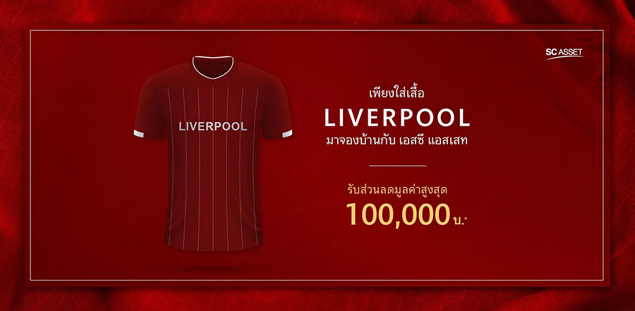 เพียงใส่เสื้อ Liverpool มาจองบ้านกับ เอสซี แอสเสท ร่วมฉลองแชมป์ใหม่กับทีมฟุตบอล Liverpool มาเลือกจอง บ้านหรือทาวน์โฮมทั้ง 36 โครงการที่เข้าร่วม รับสิทธิพิเศษสูงสุดถึง 100,000 บาท*