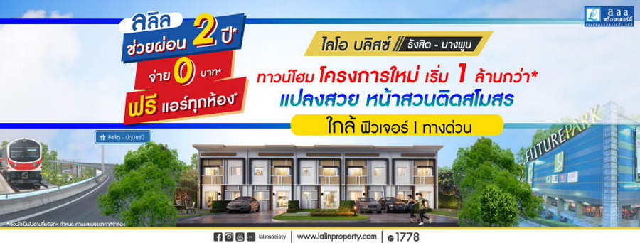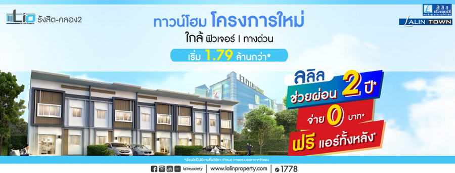 ลลิล ทาวน์ ไลโอ รังสิต - คลอง 2" ทาวน์โฮมโครงการใหม่ ใกล้ ฟิวเจอร์ ดอนเมืองโทลล์เวย์ เปิดโซนหน้าสวน ติดสโมสรหรู เริ่ม 1.79 ล้าน* ลงทะเบียนรับส่วนลดทันที 20,000 บาท