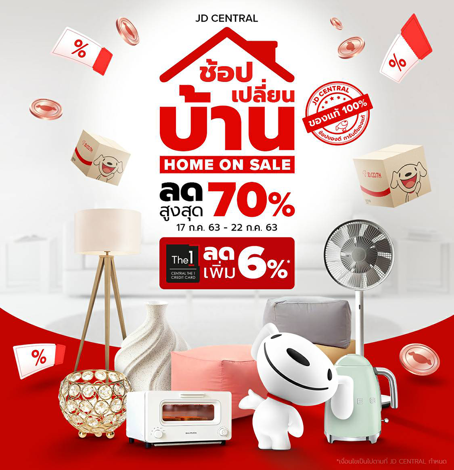 สำหรับแคมเปญ "JD CENTRAL ช้อป เปลี่ยน บ้าน Home on Sale" จัดขึ้นระหว่างวันที่ 17 - 22 กรกฎาคม 2563 นำสินค้าตกแต่งและของใช้งานภายในบ้าน รวมถึงเครื่องใช้ไฟฟ้า จากแบรนด์ยอดนิยมชั้นนำมาให้เลือกซื้อกันอย่างจุใจ ในราคาพิเศษพร้อมข้อเสนอดีๆ จำนวนมาก ดังนี้