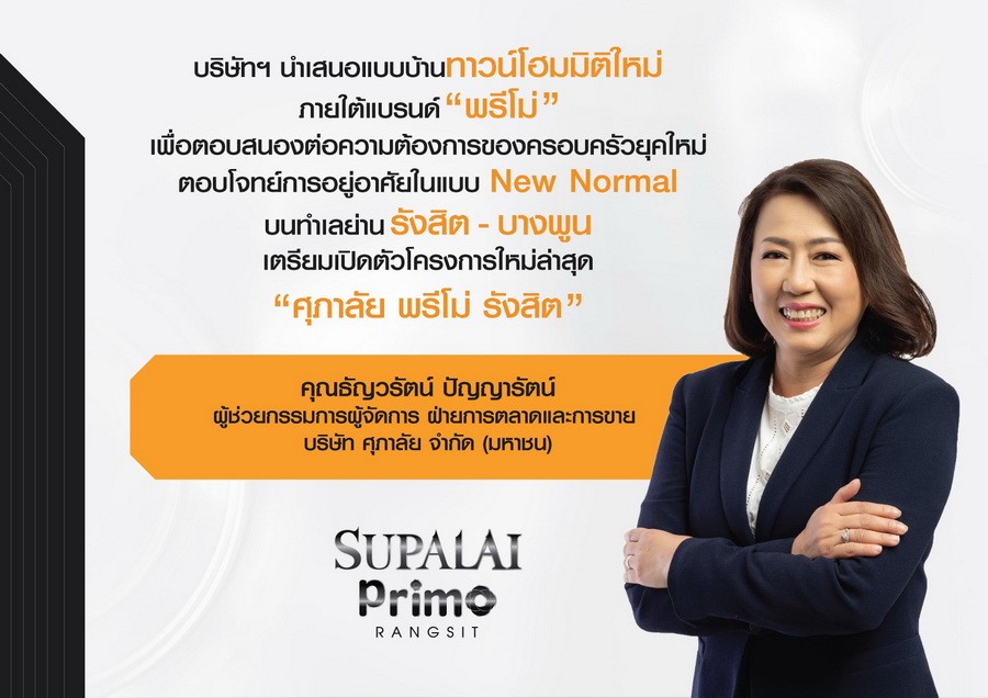 นางสาวธัญวรัตน์ ปัญญารัตน์ ผู้ช่วยกรรมการผู้จัดการ ฝ่ายการตลาดและการขาย บริษัท ศุภาลัย จำกัด (มหาชน) เปิดเผยว่า บริษัทฯ มีการพัฒนาโครงการอสังหาริมทรัพย์แนวราบในการมุ่งขยายฐานการดำเนินงานให้เติบโตตามแผนธุรกิจที่วางเป้าหมายไว้ โดยในเดือนกันยายนนี้บริษัทฯ เตรียมเปิดตัวโครงการแนวราบด้วยการนำเสนอแบบบ้านทาวน์โฮมมิติใหม่ ภายใต้แบรนด์ "พรีโม่" เพื่อตอบสนองต่อความต้องการของครอบครัวยุคใหม่ ตอบโจทย์การอยู่อาศัยในแบบ New Normal บนทำเลย่านรังสิต-บางพูน