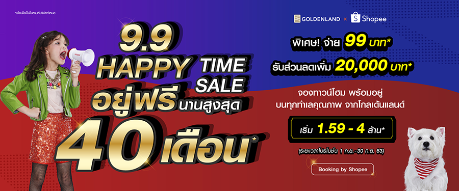 โกลเด้นแลนด์ ร่วมกับ Shopee จัดโปรโมชั่น 9.9 Happy Time Sale ฟรีนานสูงสุด 40 เดือน* พิเศษ! จ่าย 99 บาท รับส่วนลดเพิ่ม 20,000 บาท จองทาวน์โฮมพร้อมอยู่ ทุกทำเลคุณภาพ จากโกลเด้นแลนด์ ราคาเริ่ม 1.59 - 4 ล้าน* (ระยะเวลาโปรโมชั่น 1 - 30 ก.ย. 63)
