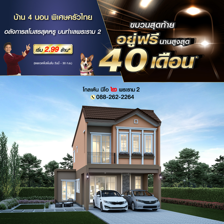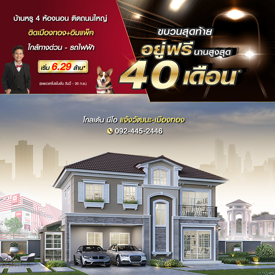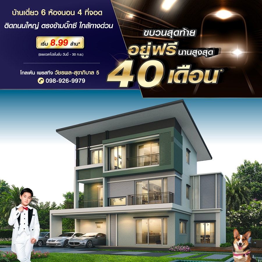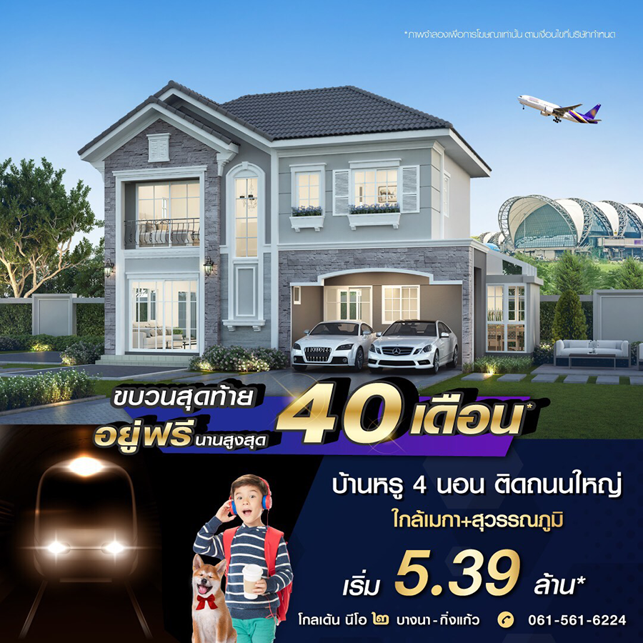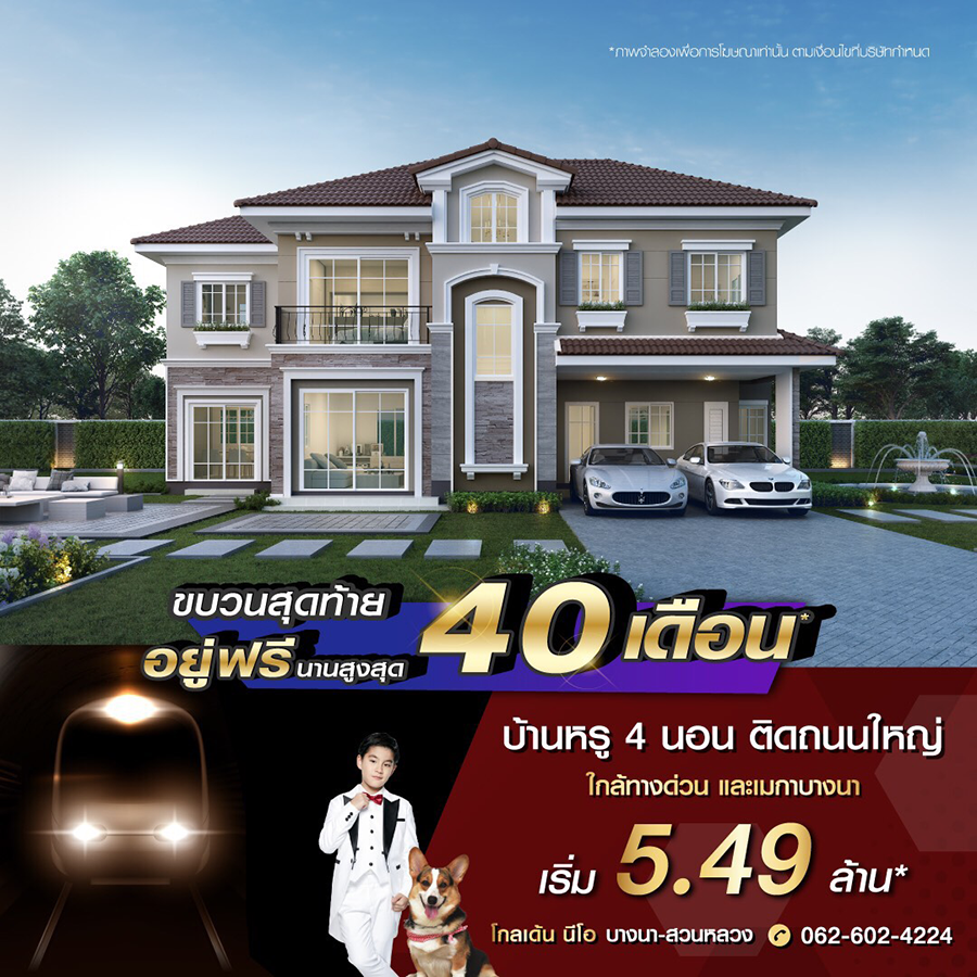 Promotion : 1 - 30 ก.ย. นี้ ปู๊น ปู๊นนนนน ลดด่วน ขบวนสุดท้าย จองให้ทันนะคร๊าบบบ โปรคุ้มเกินคุ้ม อยู่ฟรีนานสูงสุด 40 เดือน* !! กับบ้านหรู 4 ห้องนอน ติดถนนใหญ่ สุดยอดทำเลย่านบางนา ใกล้เมกา+สุวรรณภูมิ เริ่ม 5.39 ล้าน*
