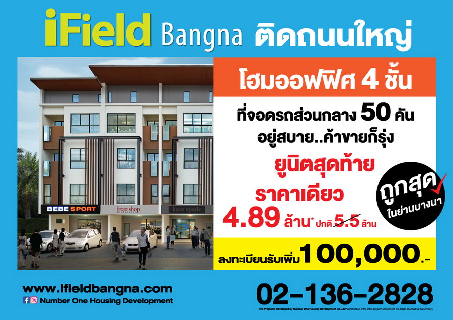นัมเบอร์วันเฮ้าส์ซิ่ง ดิเวลลอปเม้นท์ ผู้พัฒนาทาวน์โฮมและโฮมออฟฟิศคุณภาพ การันตีด้วยรางวัลที่อยู่อาศัยดีเด่น "โครงการไอฟีล บางนา" จัด flash sale โฮมออฟฟิศ 4 ชั้น ยูนิตสุดท้าย!! ดีไซน์ทันสมัย ลงตัวครบทุกฟังก์ชัน ถูกที่สุดในย่านบางนา!! อยู่สบายค้าขายก็รุ่ง ติดถนนใหญ่ไม่ต้องเข้าซอย เดินทางสะดวกสบาย ใกล้พระราม 9 - อ่อนนุช - บางนา - สนามบินสุวรรณภูมิ พร้อมให้คุณมีคุณภาพชีวิตที่เหนือกว่า ชั้น 1 - 2 รองรับการทำธุรกิจ ชั้น 3 - 4 เพื่ออยู่อาศัย พื้นที่ใช้สอย 230 ตร.ม. บนที่ดิน 21.3 ตร.ว.ราคาพิเศษเพียง 4.89 ล้านบาท จากราคาปกติ 5.5 ล้านบาทมาพร้อม 3 ห้องนอนขนาดใหญ่ มีห้องน้ำทุกชั้น มุมพักผ่อนชั้นบนเพื่อความเป็นส่วนตัว ห้องอเนกประสงค์ที่ปรับเปลี่ยนเป็นห้องทำงานหรือห้องประชุมได้ตามใจ ที่จอดรถ 2 คัน และที่จอดรถส่วนกลางอีก 50 คัน พร้อมคลับเฮ้าส์หรูและสวนสวยกระจายตัวทั่วโครงการ ลงทะเบียนที่ www.ifieldbangna.com รับแคชแบคเพิ่มอีก 100,000 บาท