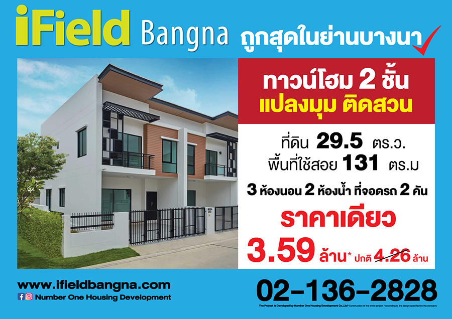 สำหรับทาวน์โฮม 2 ชั้น แปลงมุมติดสวน มีที่ดินขนาด 29.5 ตร.ว. พื้นที่ใช้สอย 131 ตร.ม. 3 ห้องนอน 2 ห้องน้ำ 2 ที่จอดรถ ราคาพิเศษเพียง 3.59 ล้านบาท จากราคาปกติ 4.26 ล้านบาท สำหรับผู้ที่สนใจ สามารถเข้าเยี่ยมชมบ้านจริงได้ที่โครงการไอฟีล บางนา เปิดการทำทุกวัน เวลา 09.00 - 18.00 น.สอบถามรายละเอียดเพิ่มเติมได้ที่ โทร. 02-136-2828 หรือคลิก https://www.ifieldbangna.com/gallery.phpแท็กที่เกี่ยวข้อง :