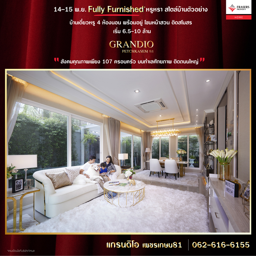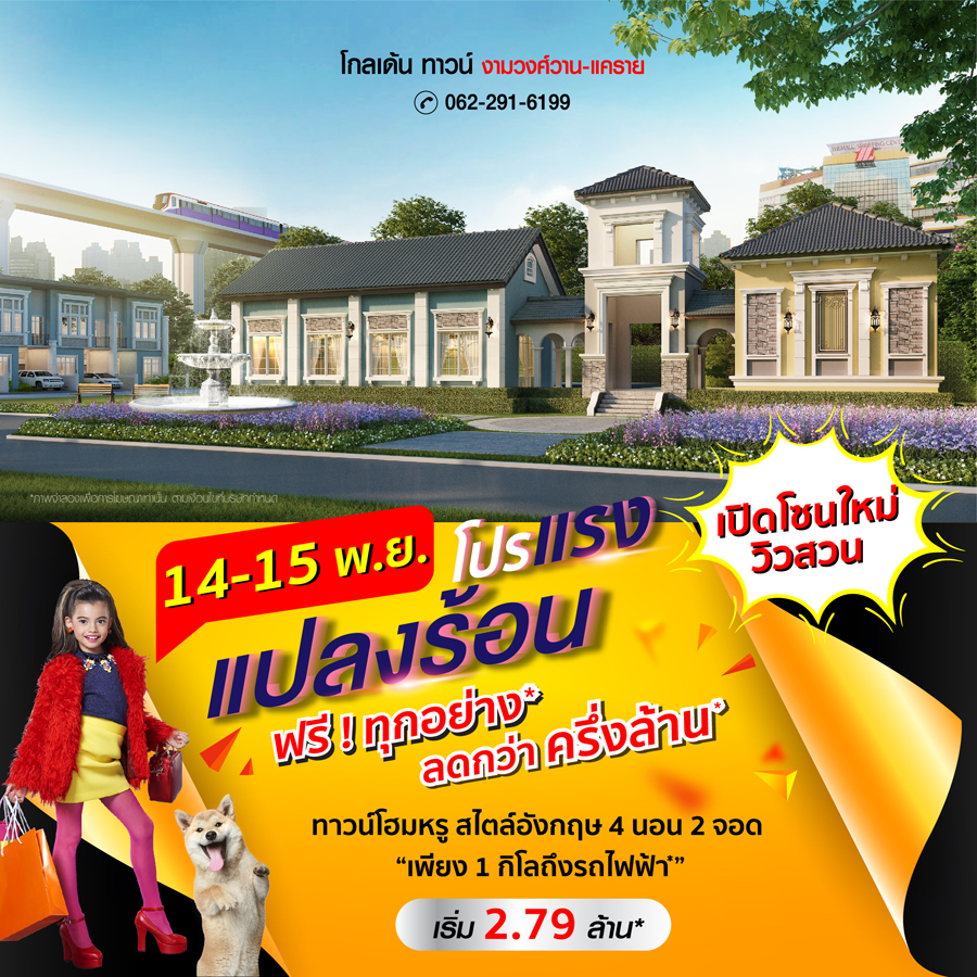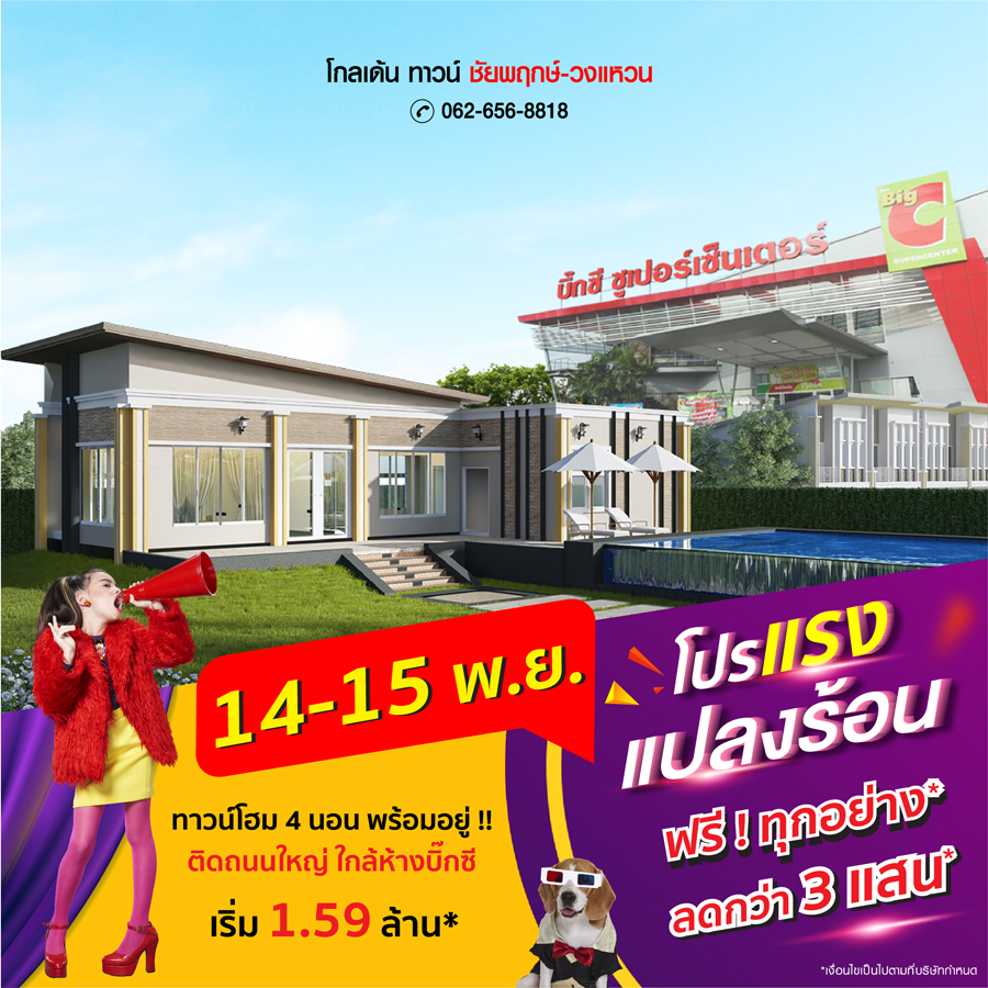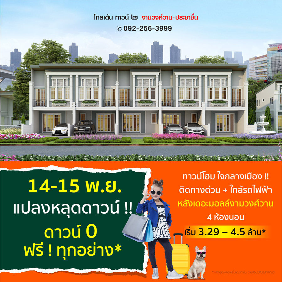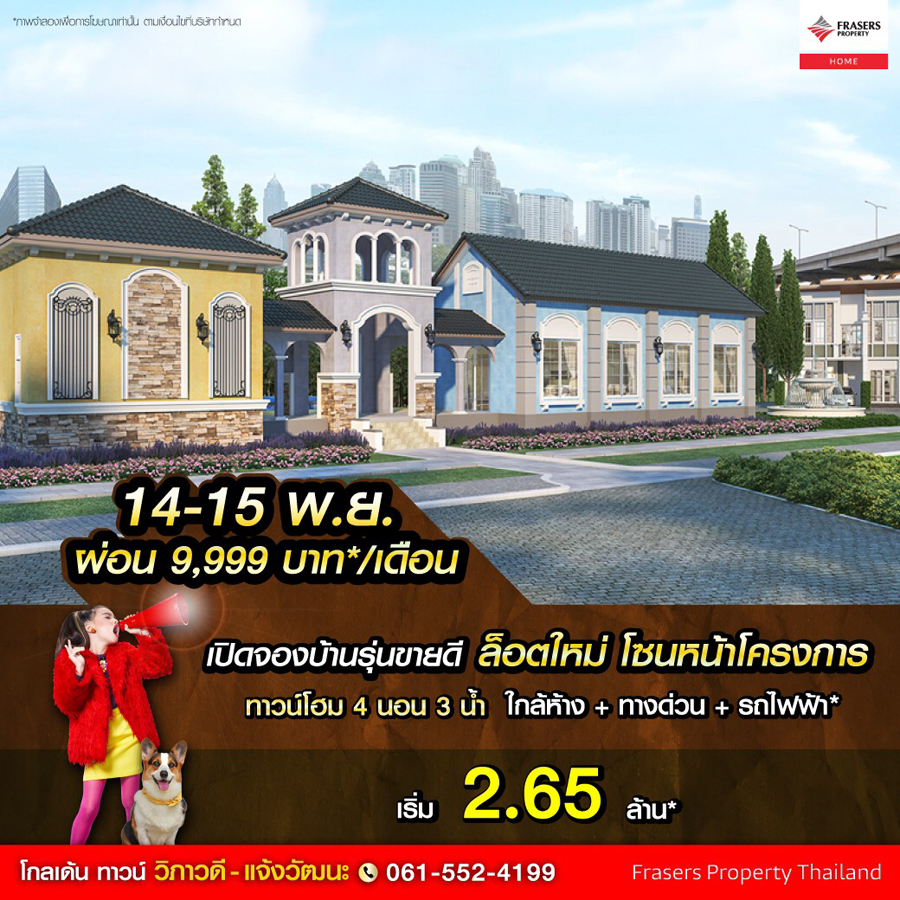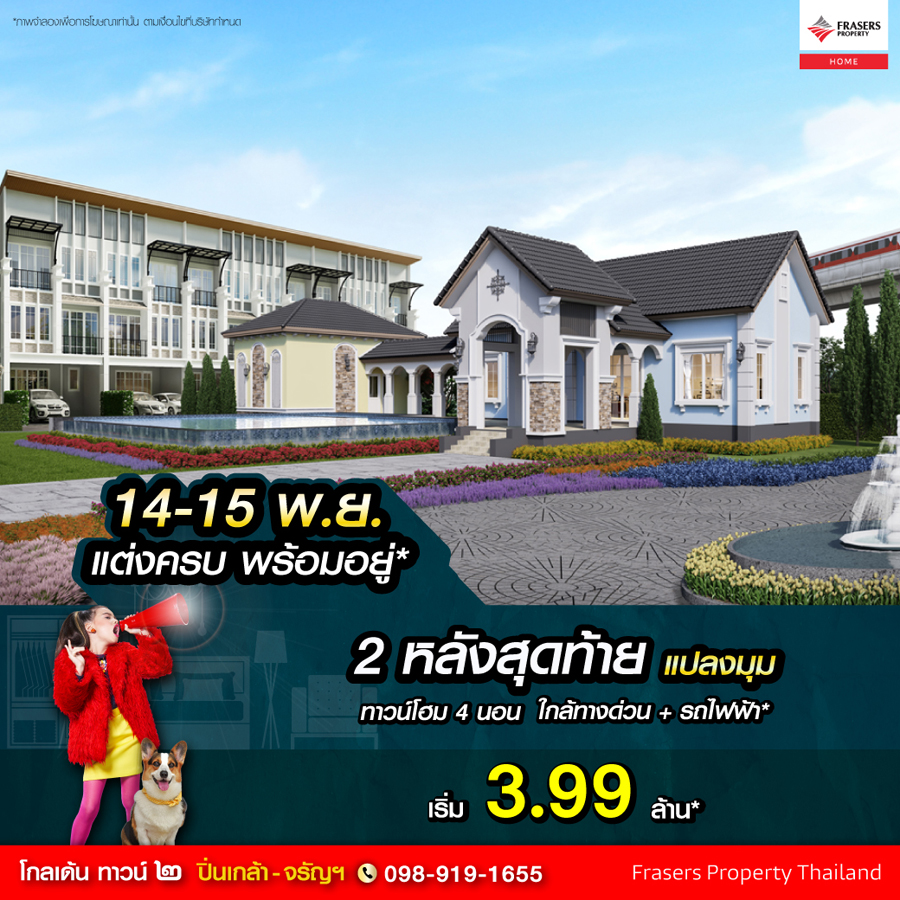Promotion : 14-15 พ.ย. นี้ ผ่อน 9,999 บาท*/เดือน เปิดจองบ้านรุ่นขายดี ล็อตใหม่ โซนหน้าโครงการ รีบเล้ย ทาวน์โฮม 4 ห้องนอน 3 ห้องน้ำ พร้อมห้องพระ + โรงหนังส่วนตัว* อลังการสโมสรสไตล์อังกฤษ บนทำเลศักยภาพ ใกล้ห้างฯ + ทางด่วน + รถไฟฟ้า* เริ่ม 2.65 ล้าน*