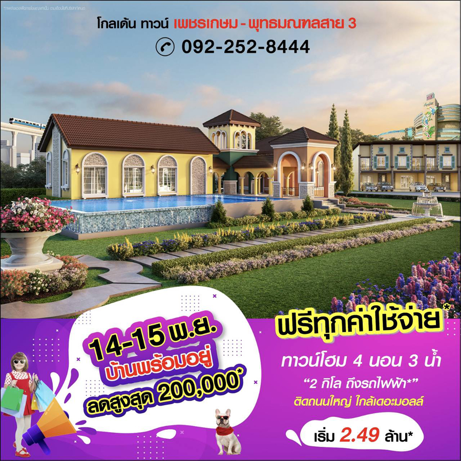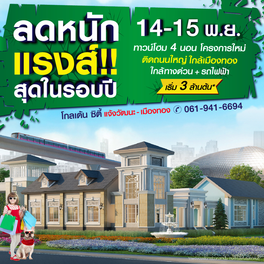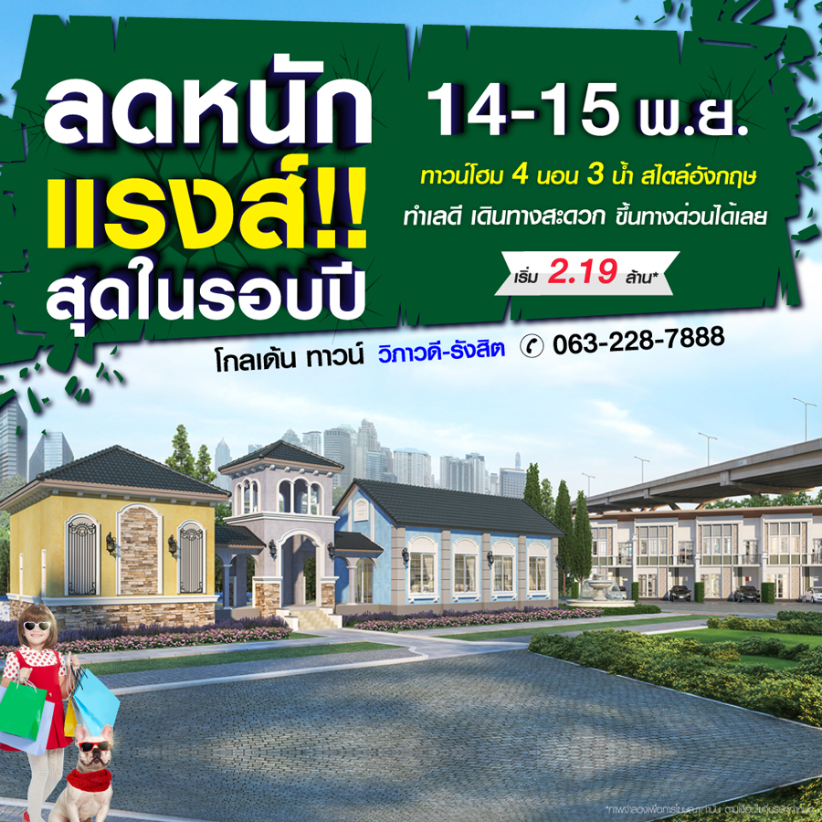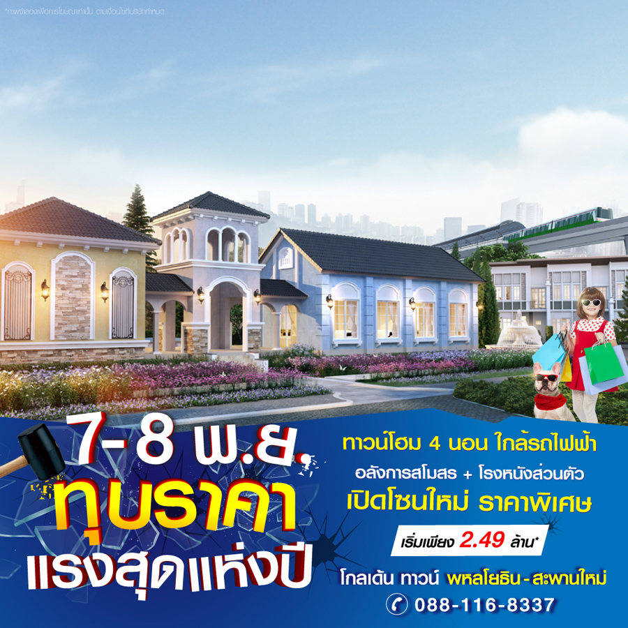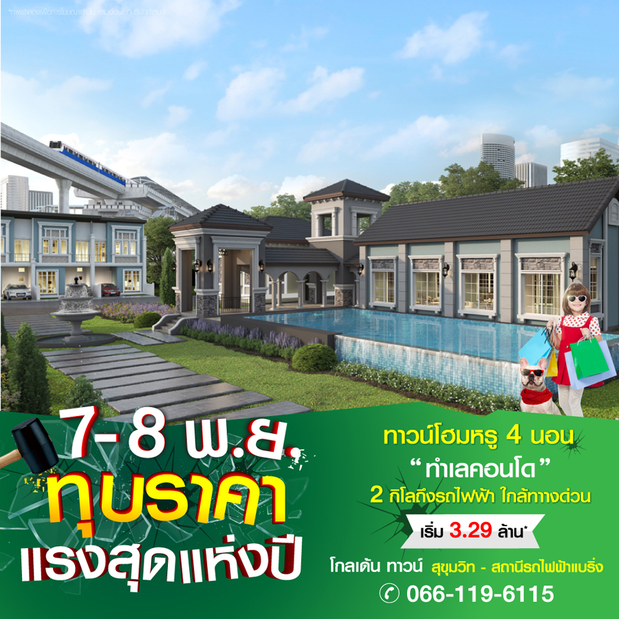 Promotion : 7-8 พ.ย. นี้ ทุบราคา แรงสุดแห่งปี เปิดโซนใหม่ ราคาพิเศษ เริ่มเพียง 2.49 ล้าน* ทาวน์โฮมหรู สไตล์อังกฤษ ขนาด 4 ห้องนอน พร้อมห้องพระ+ครัวไทย อลังการสโมสร + โรงหนังส่วนตัว เดินทางสะดวก ใกล้รถไฟฟ้า