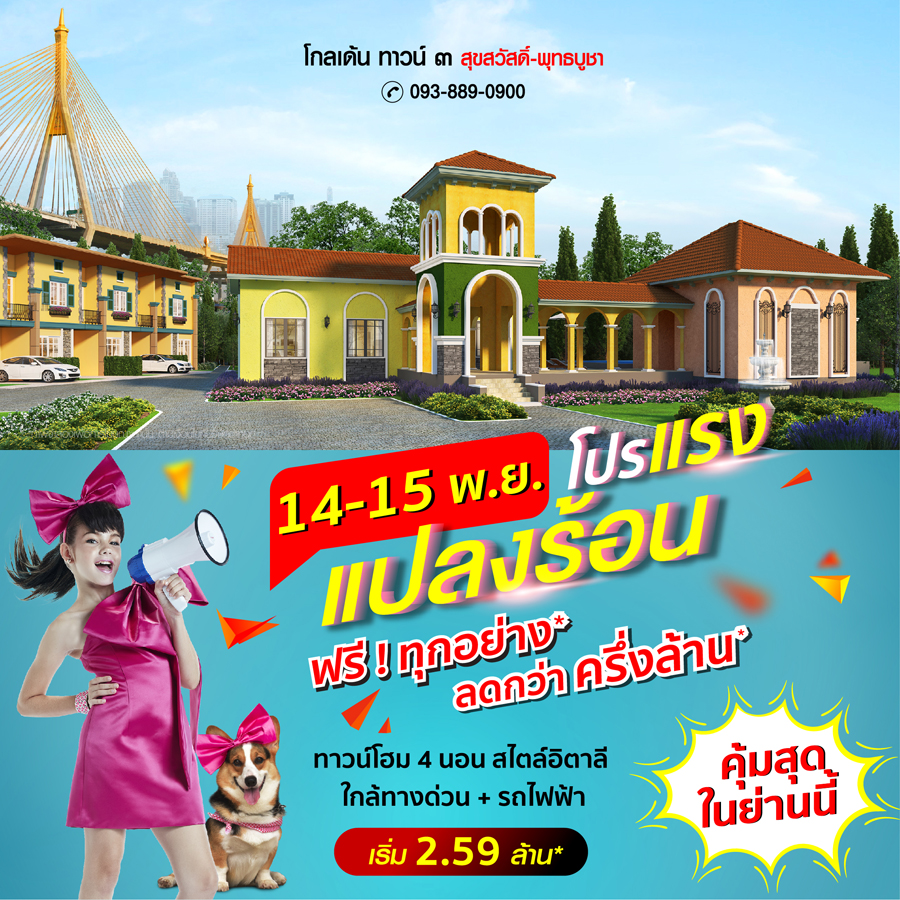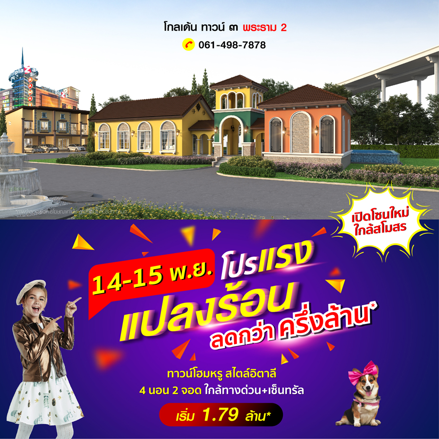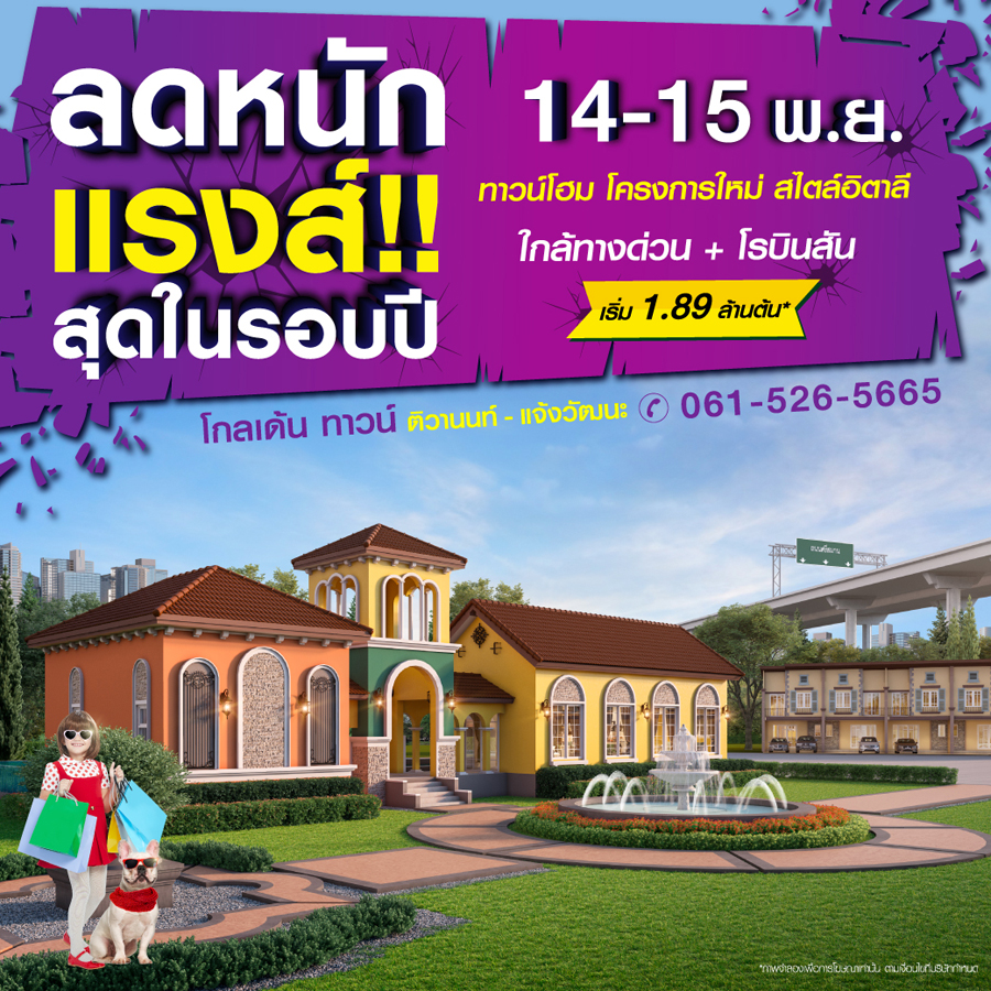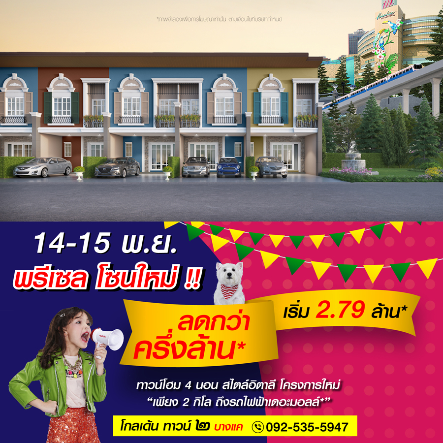 Promotion : 14-15 พ.ย. นี้ โปรแรง แปลงร้อน ห้ามพลาด รับส่วนลดสุดฟิน กว่าครึ่งล้าน* พิเศษ เปิดโซนใหม่ใกล้สโมสร ทาวน์โฮมหรู สไตล์อิตาลี 4 ห้องนอน 2 ที่จอดรถ โซนใกล้สโมสร สวนสวย ติดถนนใหญ่ ใกล้ทางด่วน + เซ็นทรัล เริ่ม 1.79 ล้าน*