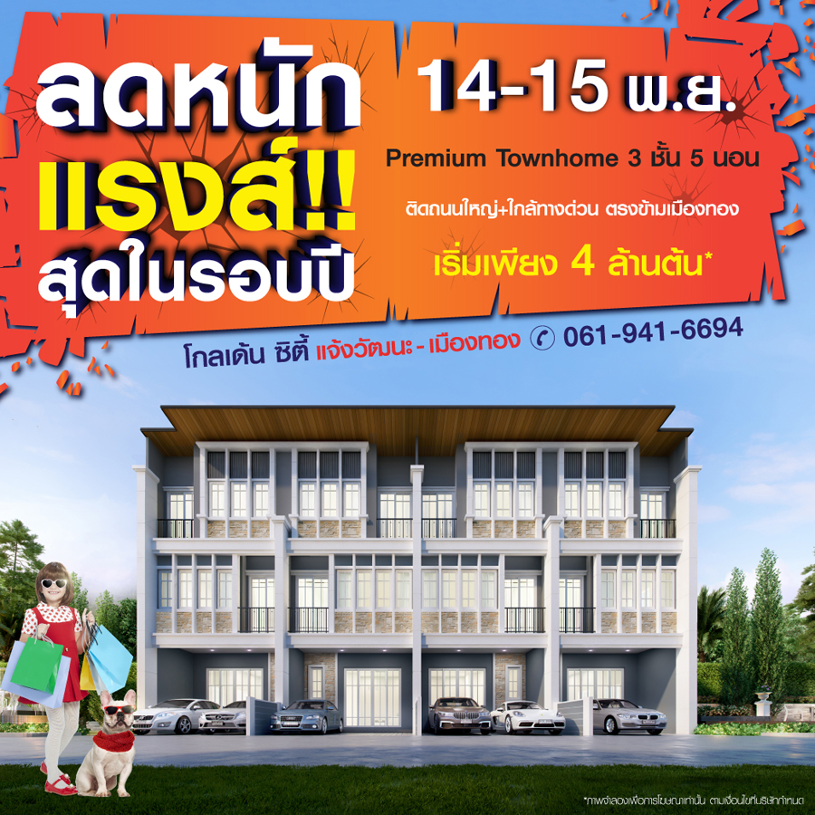 Promotion : 14 - 15 พ.ย. นี้ ลดหนัก แรงส์!!! สุดในรอบปี คุ้มกว่านี้ไม่มีอีกแล้ว ทาวน์โฮมหรู 4 ห้องนอน โครงการใหม่ สไตล์อังกฤษ ติดถนนใหญ่ ใกล้เมืองทอง + ทางด่วน + รถไฟฟ้า เริ่ม 3 ล้านต้น*